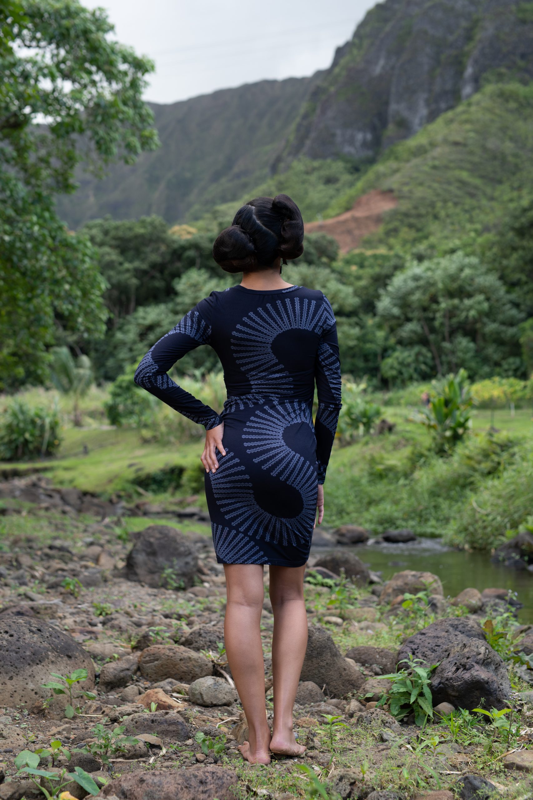 Model wearing Kaimana Dress in Deep Well/Folkstone Grey Lalani Kalalea - Back View