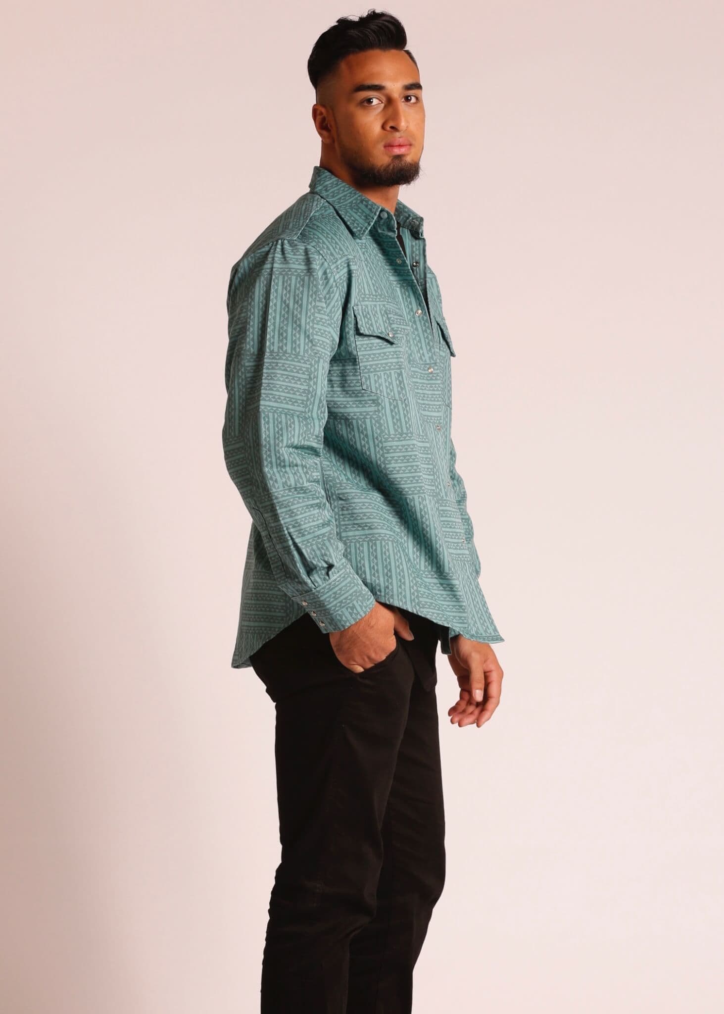Male Model wearing Long Sleeve Button Up Shirt in Green - Side View