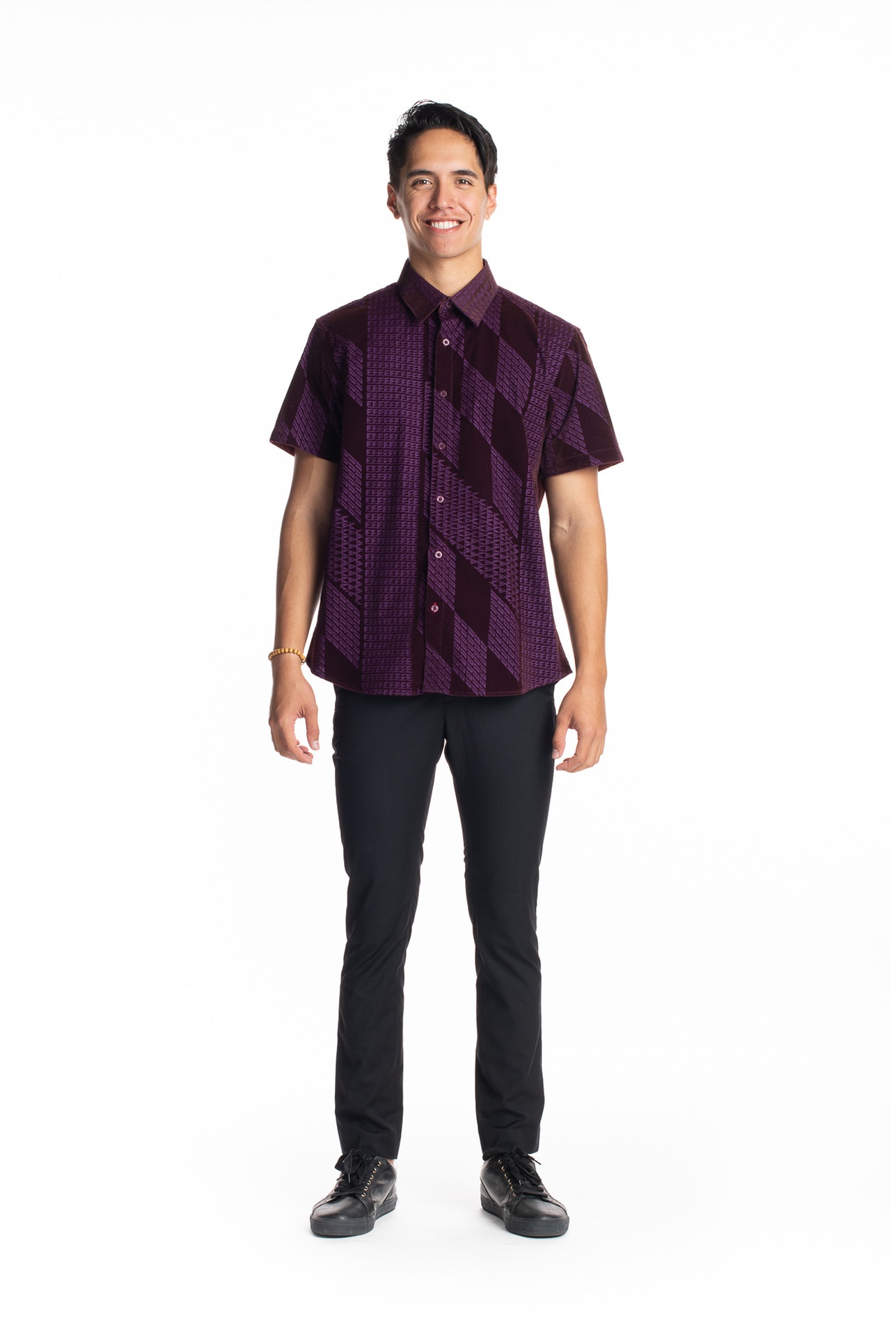 Male model wearing Aloha Short Sleeve in Purple Kamehameha - Front View