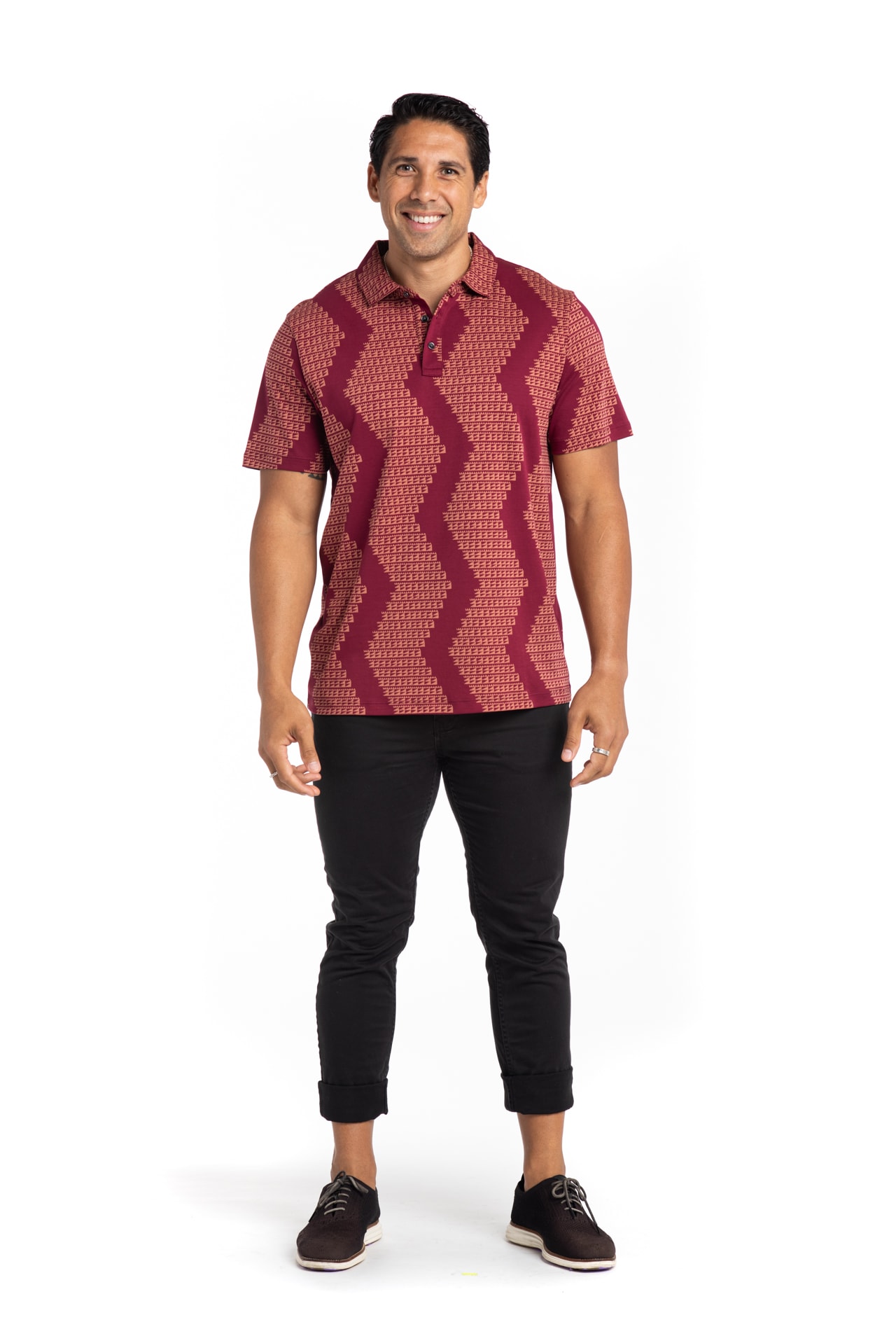 Male model wearing Waikii Polo in Rhod/Copper Brown Niho Mano - Front View