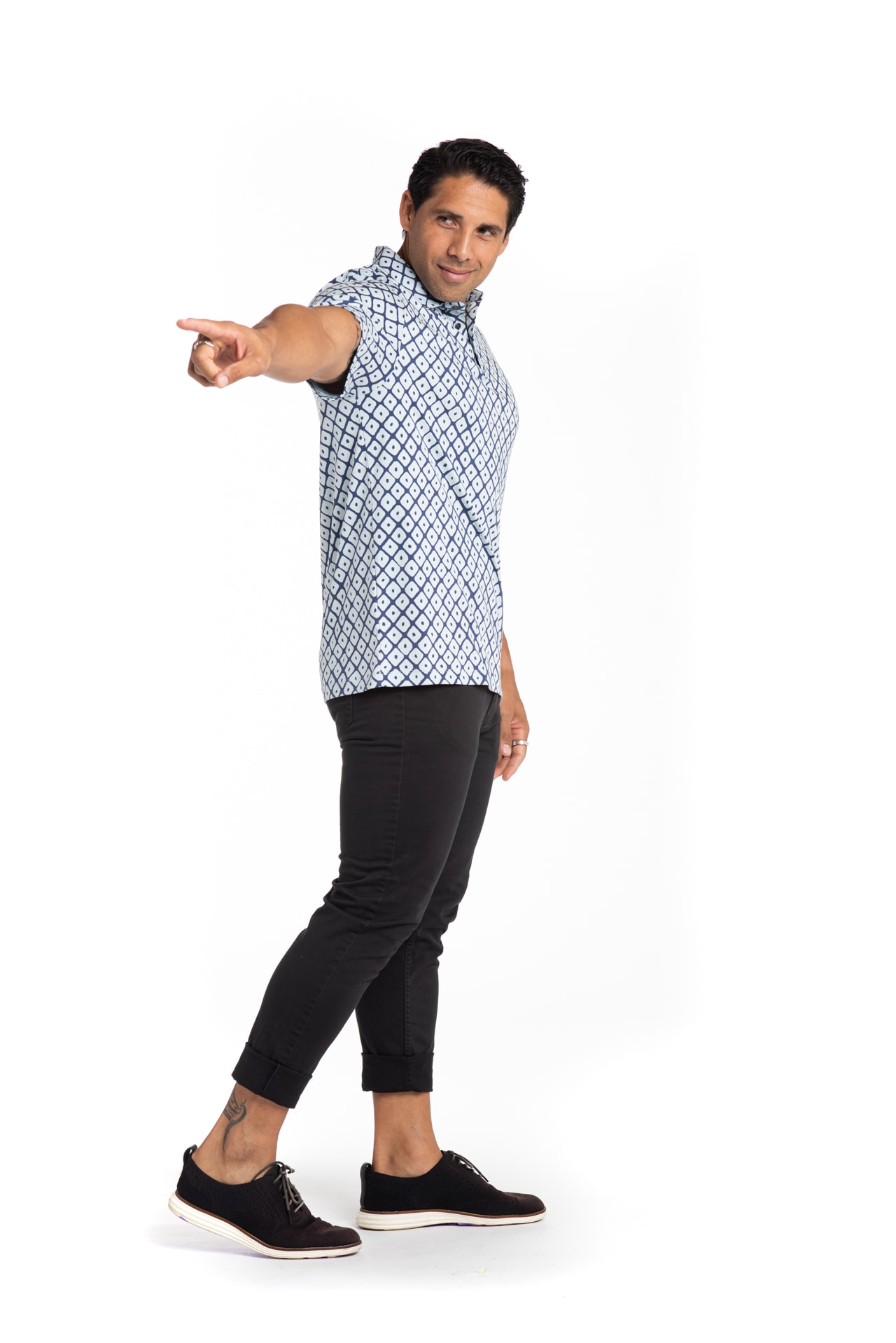 Male model wearing Waikii Polo in Blue Indigo/Celestral Blue Upena - Side View