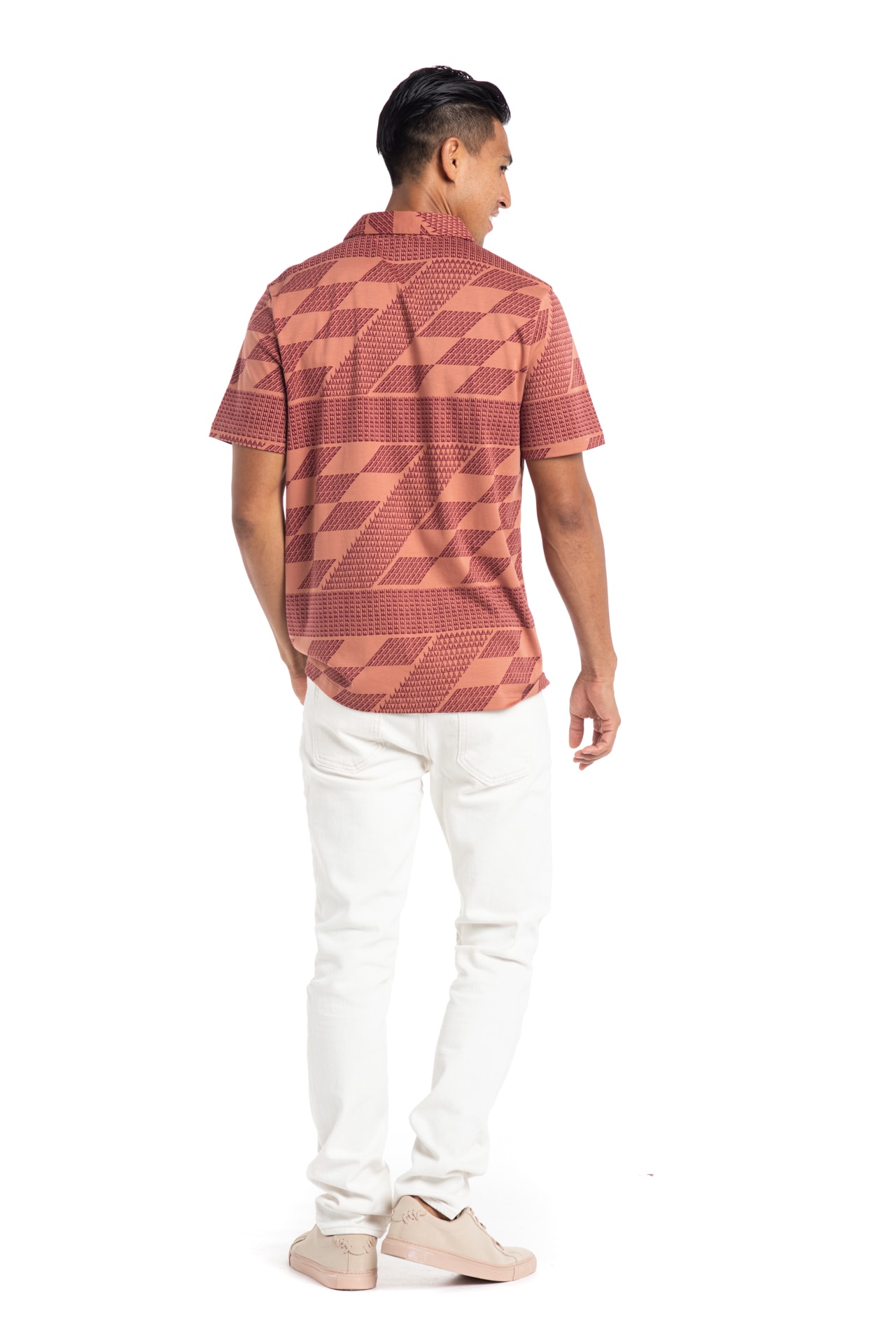 Male model wearing Waikii Polo in Rhod/Copper Brown Kamehameha - Back View